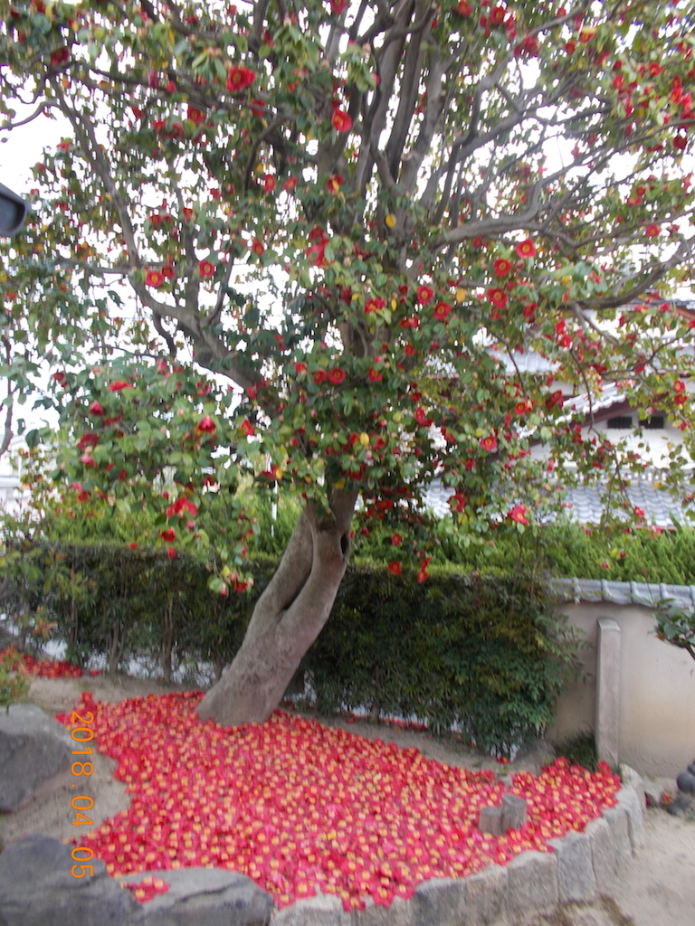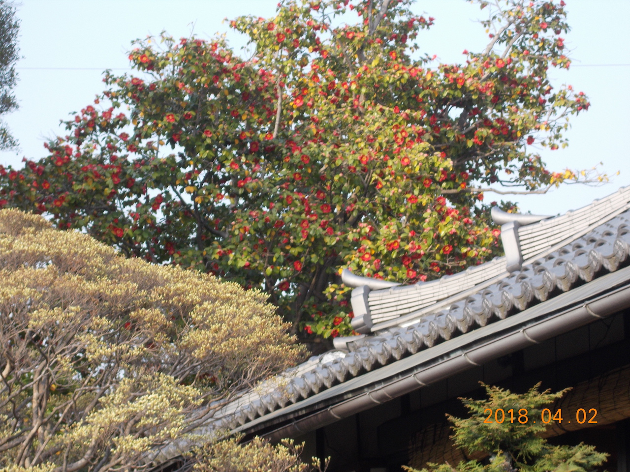 境内庭園にある推定樹齢400年の「熊谷椿」が開花しています。